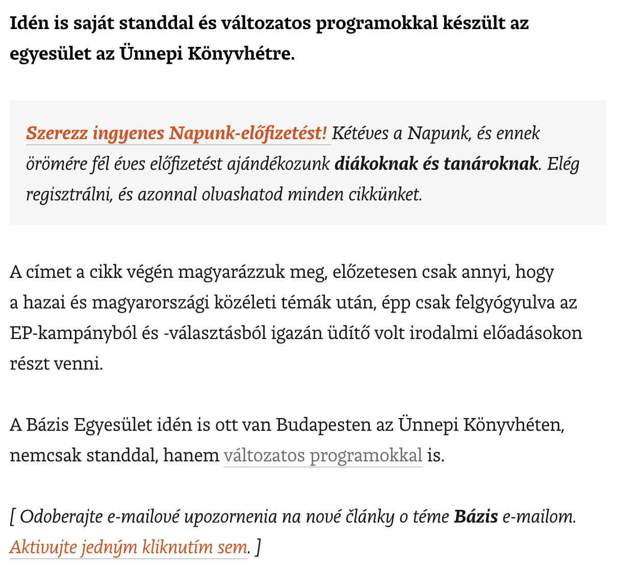 Renczes Ágoston írt tudósítást a Bázis budapesti könyvheti programjairól a Napunkon. Teljes terjedelemben a Napunk online felületén olvasható.