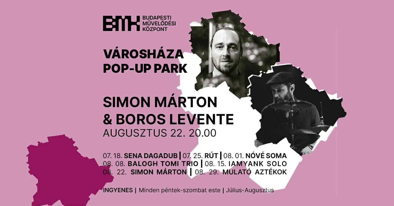 Simon Márton és Boros Levente koncertjére kerül sor a Városháza Parkban (Budapest, Károly Körút) 2025. augusztus 22-én 20.00-tól. Bővebb információk az esemény Facebook-oldalán olvashatók: