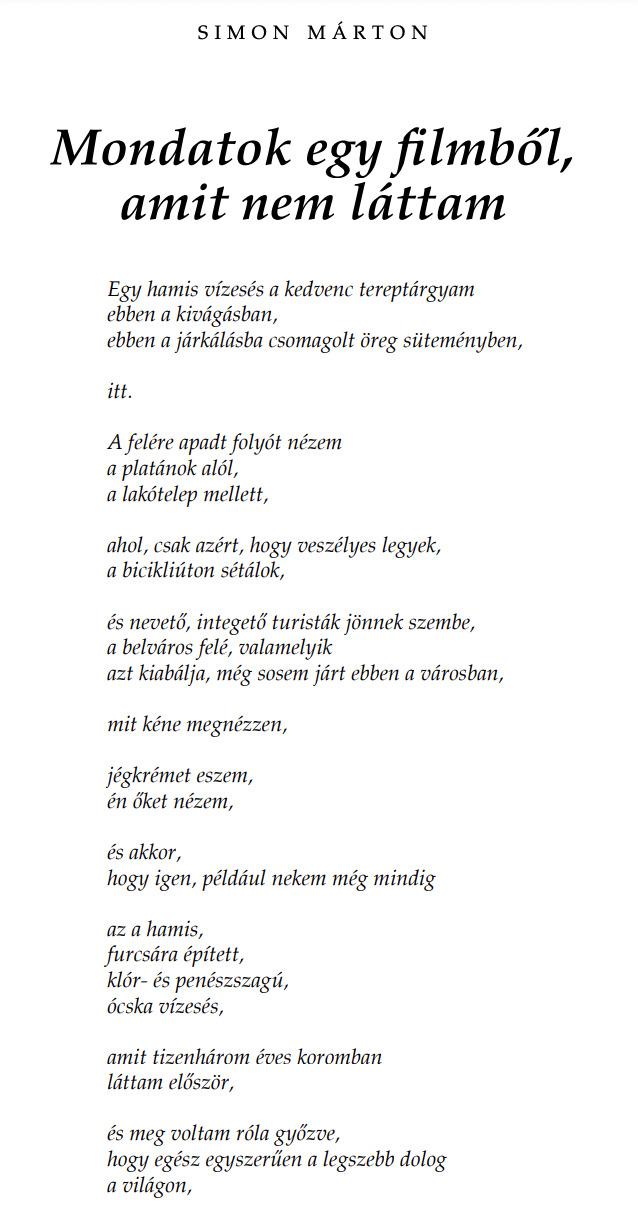 Simon Márton Mondatok egy filmből, amit nem láttam, Ne írjál fölé semmit és Valami mentse meg az életem című versei a Jelenkor 2023/7-8. számában jelentek meg. Teljes terjedelemben a nyomtatott Jelenkorban olvashatók.