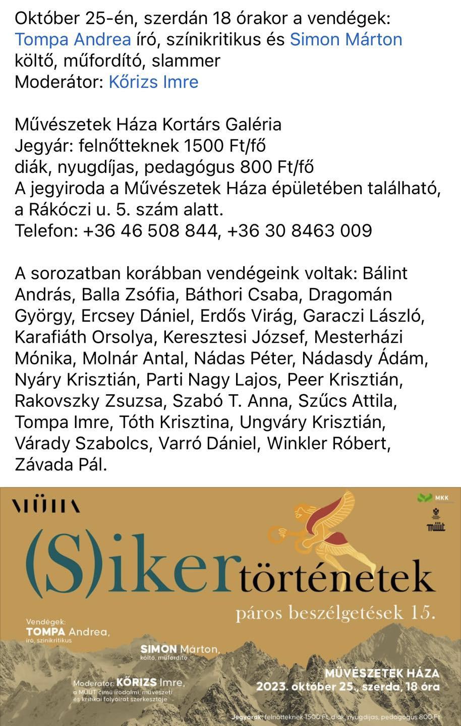 Simon Mártonnal és Tompa Andreával Kőrizs Imre beszélget Miskolcon, a Művészetek Házában 2023. október 25-én 18.00-kor.
