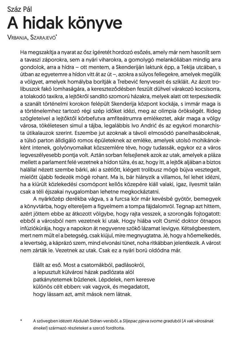 Száz Pál A hidak könyve (Vrbanja, Szarajevó) című esszéregényrészlete az Alföld 2023/1. számában jelent meg. Teljes terjedelemben a nyomtatott Alföldben vagy a Szófán olvasható.