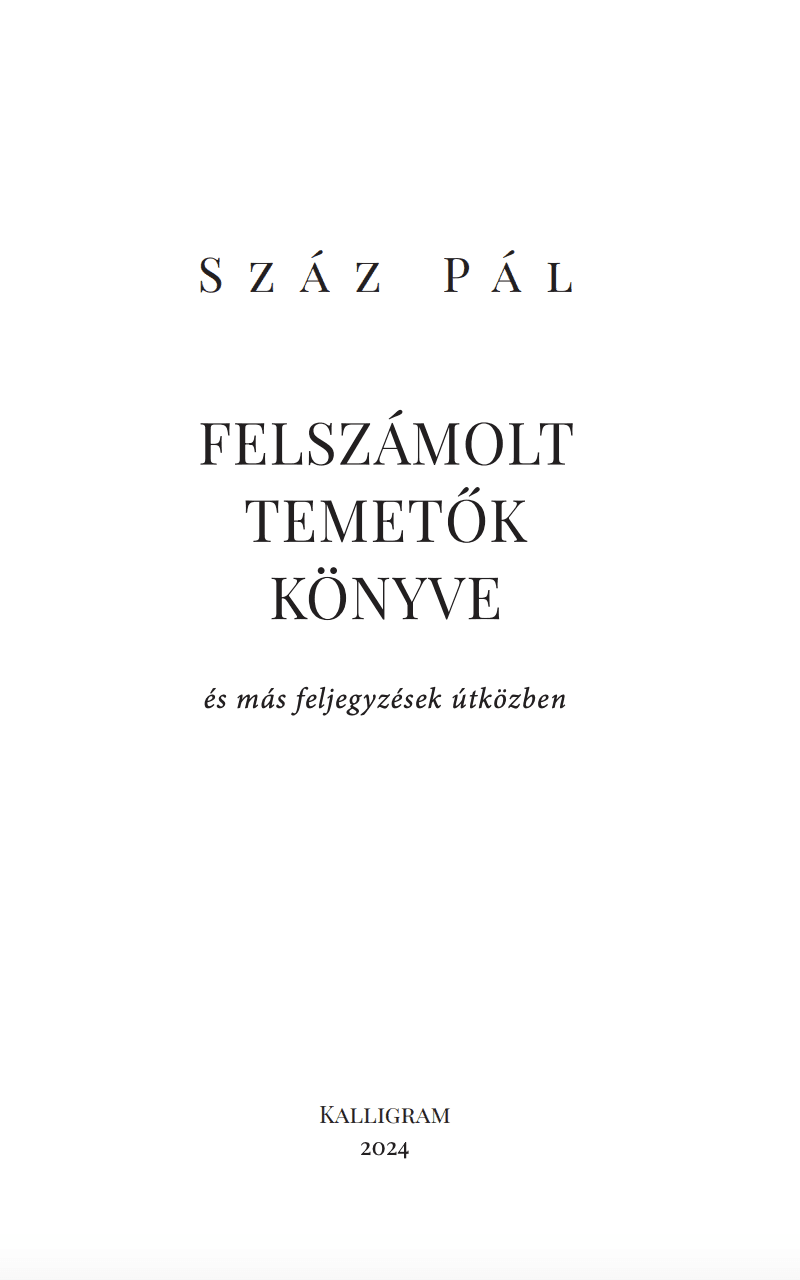 Megjelent Száz Pál Felszámolt temetők könyve és más feljegyzések útközben című kötete a Kalligram Kiadó gondozásában, a Bázis-könyvek sorozat 46. darabjaként! Felelős kiadó: Ágoston Attila. Szerkesztette: Kovács Kitti. Borítóterv, grafikai elrendezés és nyomdai előkészítés: Csillag Lajos.