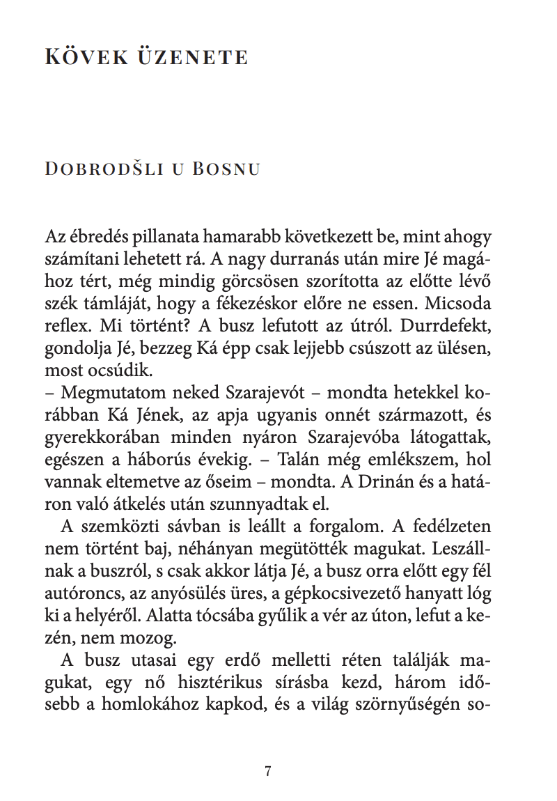 „Az egyént puszta alkatrésszé szedve s redukálva ott rejtőznek a középkori Párizs lakóinak csontjai a René Coty sugárút alatt, a katakombák bugyrainak raktárszerűen egymásra halmozott osszáriumában. Ott hallgatnak a Prága városából kiutasított zsidók utódai a Palmovka kereszteződése mellett az élőkkel, csak épp a villamos helyett a feltámadásra várnak [...] A Marsall Tito és az Ali pasa sugárút forgalmas kereszteződése alatt pihennek a régi sehidek és gázik sírjai, akik elhozták az iszlám fényét Szarajevó völgyébe. [...] A bölcs rabbi és társainak sírköveit minden nap beárnyékolja a žižkovi tévétorony, amely a temető földjéből ágál, híreket szállítva a készülékekbe. Miért pont egy Drina-menti hegyi faluban kell a buszunknak vesztegelnie egy halálos baleset felmérése és nyomainak eltüntetése közben, pont ott, ahol míg az ember a belgrádi járatra várakozik, amely talán hamarabb megérkezik, mint amíg a vért feltakarítják, pont azon a helyen, amelyről kiderül, hogy egy bokorral benőtt középkori nekropolisz.”