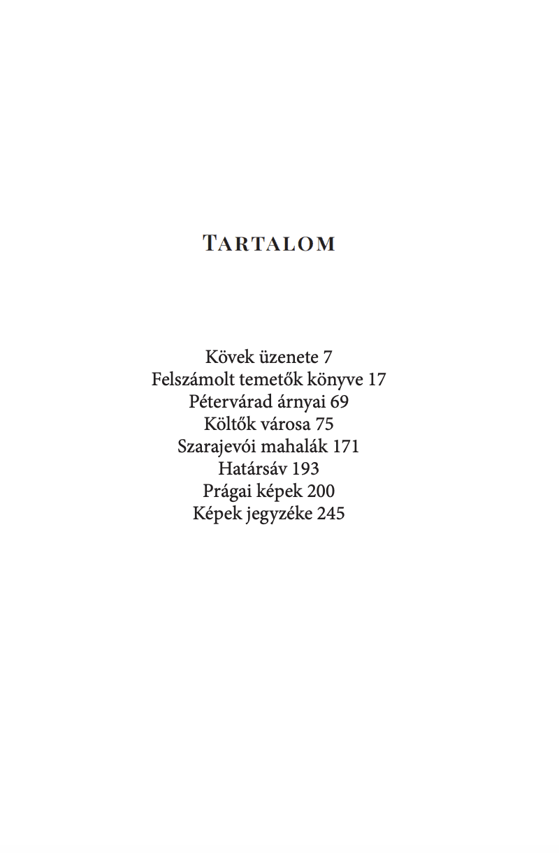A kötet írásai olyan feljegyzéseken alapulnak, amelyek különféle utazások hatására születtek, Párizshoz, Szarajevóhoz, Prágához, Pozsonyhoz, Bécshez, Zágrábhoz, Splithez és Dalmáciához kapcsolódnak. Bennük e helyek rejtett történetei tárulnak fel, olyanok, amelyek gyakran nemcsak a turista vagy az idegen, de a helybéli szeme előtt is rejtve maradnak. Az írások az útirajz, az esszé, az elbeszélés műfajai között egyensúlyoznak, az utazások és ottlétek élményei kultúrtörténeti elemekkel vagy éppen anekdotafoszlányokkal vegyülnek.