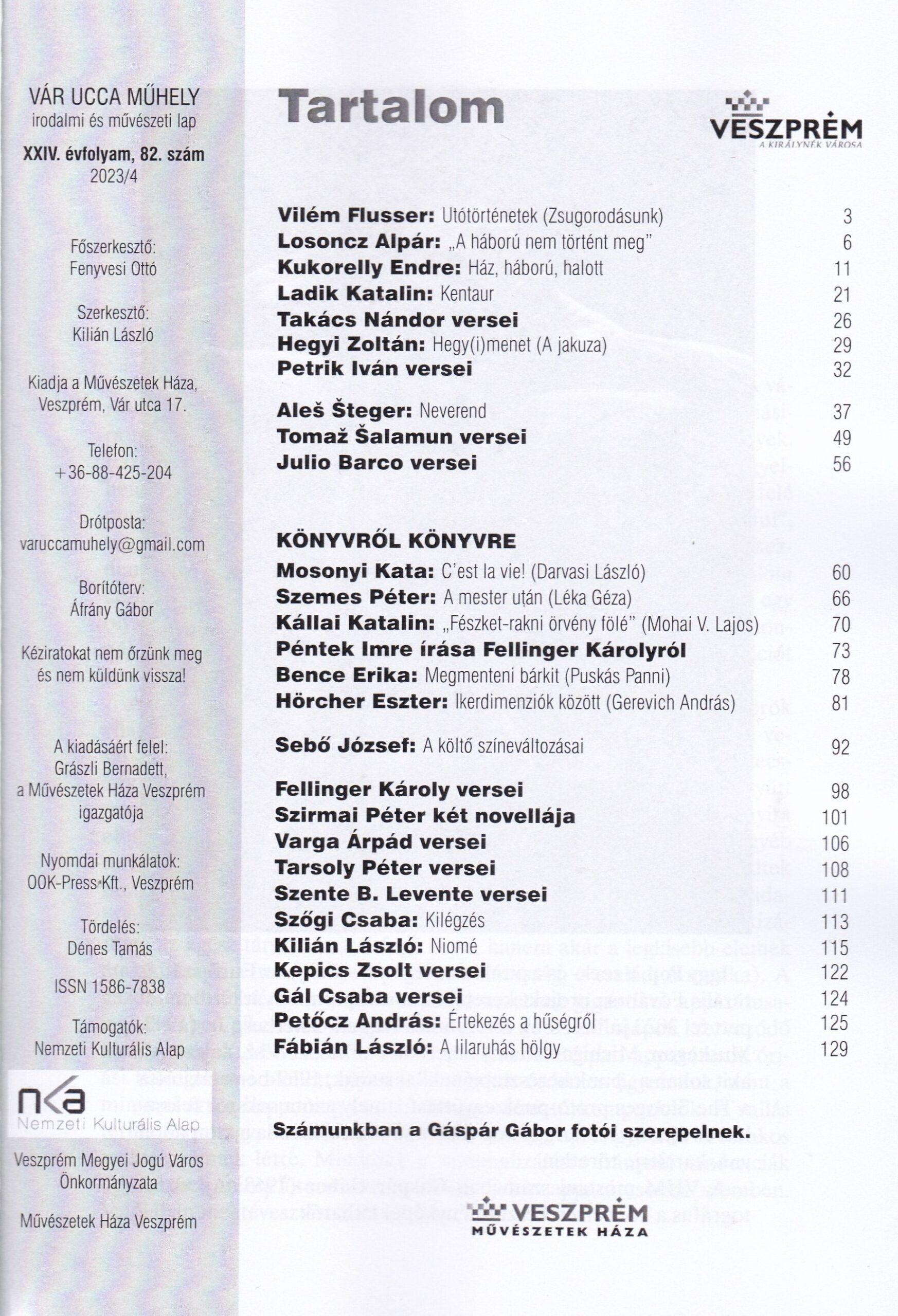 A VÁR UCCA MŰHELY folyóirat 82. lapszámának bemutatója 2023. augusztus 30-án, szerdán 17:30-kor a Művészetek Háza Veszprém klubhelyiségében (a Csikász Galéria fölött, az első emeleten, Veszprém Vár utca 17.)