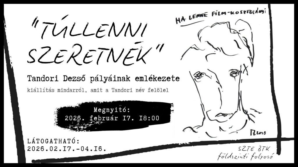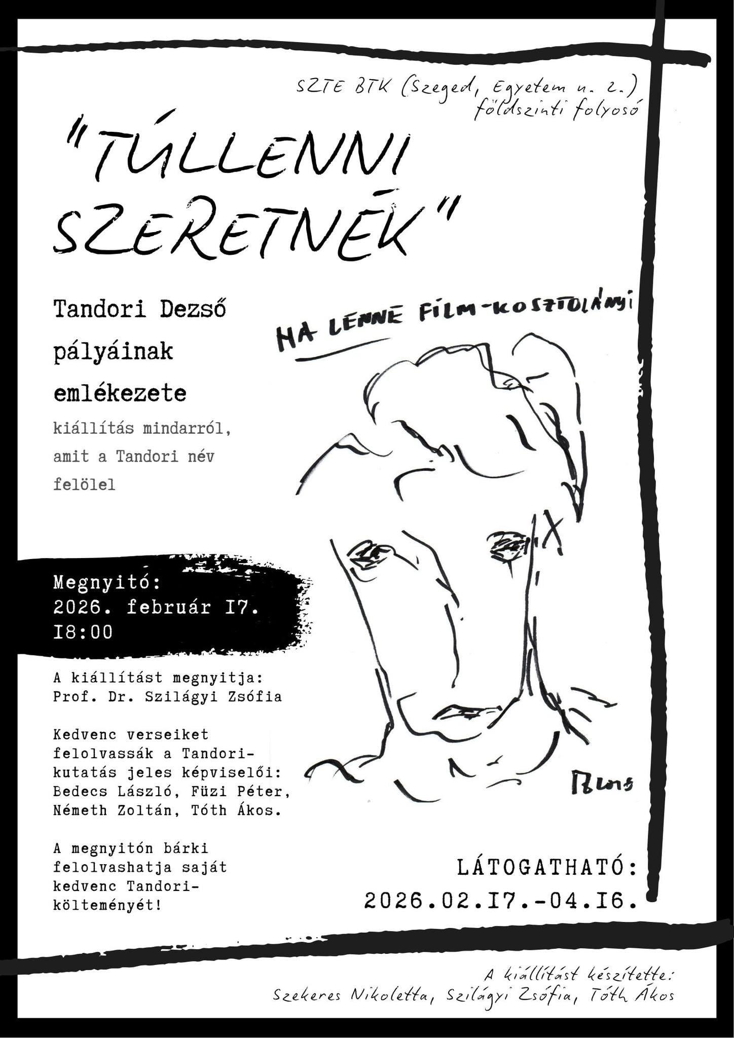"Túllenni szeretnék" - Tandori Dezső pályáinak emlékezete címmel kerül sor kiállításmegnyitóra a Szegedi Tudományegyetemen (Egyetem u. 2.) 2026. február 17-én 18.00-kor. A kiállítást készítették: Szekeres Nikoletta, Szilágyi Zsófia, Tóth Ákos. Az eseményt megnyitja: Szilágyi Zsófia. Tandori-verset olvas fel: Füzi Péter, Bedecs László, Németh Zoltán, Tóth Ákos, valamint a közönségből jelentkezők. Bővebb információk az esemény Facebook-oldalán olvashatók: