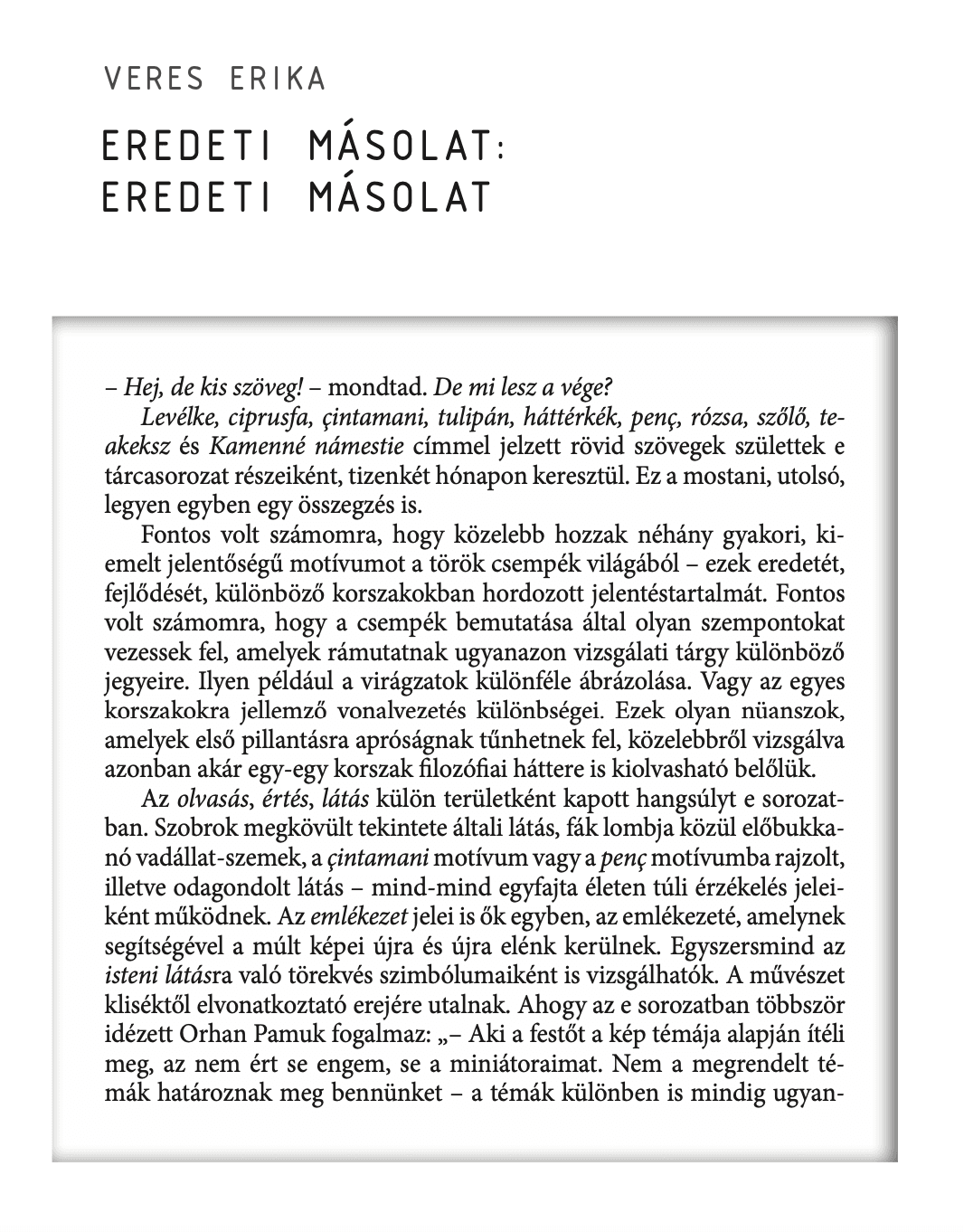 Veres Erika Eredeti másolat-ciklusának a befejező darabja az Irodalmi Szemle 2022/12. számában jelent meg. Teljes terjedelemben a nyomtatott Irodalmi Szemlében vagy az Irodalmi Szemle online felületén olvasható.