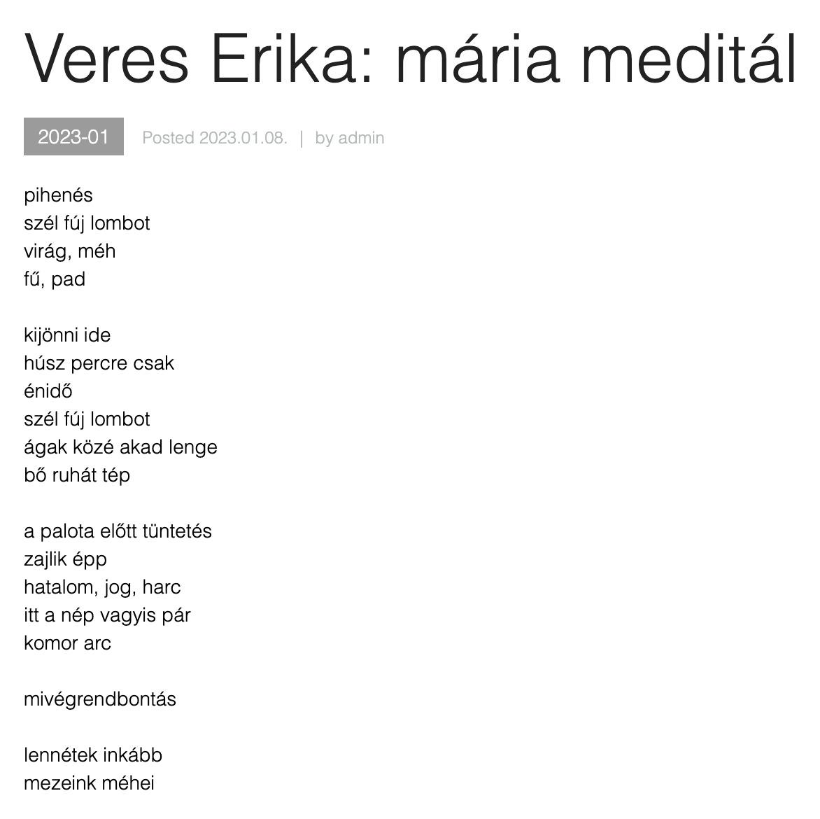 Veres Erika mária meditál című verse az Irodalmi Szemle 2023/1. számában jelent meg, teljes terjedelemben az Irodalmi Szemle online felületén olvasható.
