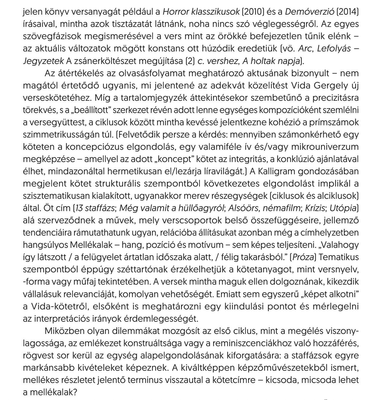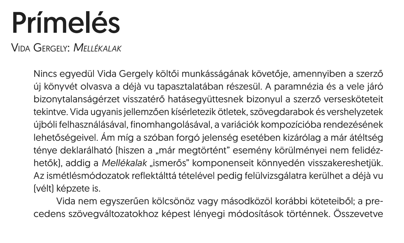 Vida Gergely Mellékalak (Kalligram, 2022) című verseskötetéről Urbán Andrea írt kritikát az Alföld 2023/1. számába. A kritika teljes terjedelemben a nyomtatott Alföldben vagy a Szófán olvasható.