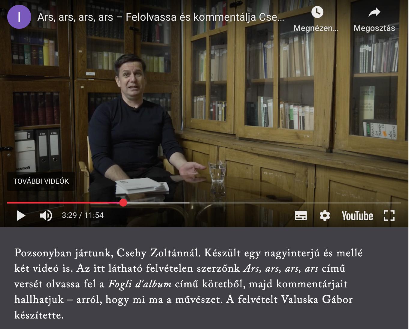 Csehy Zoltán olvassa fel és kommentálja Ars, ars, ars, ars című versét a Litera TV-ben. A videófelvétel a Litera online felületén tekinthető meg.