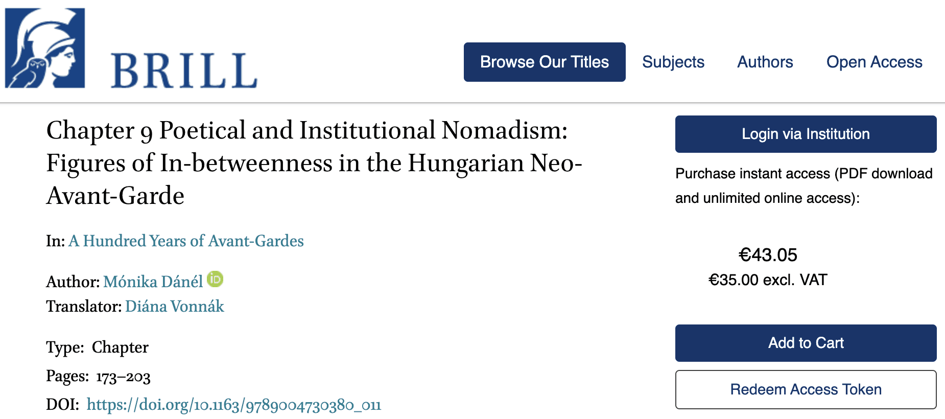 Mónika Dánél’s study, Chapter 9 Poetical and Institutional Nomadism: Figures of In-betweenness in the Hungarian Neo-Avant-Garde, has been published in the Brill volume A Hundred Years of Avant-Gardes. For more information: https://brill.com/display/title/71958.