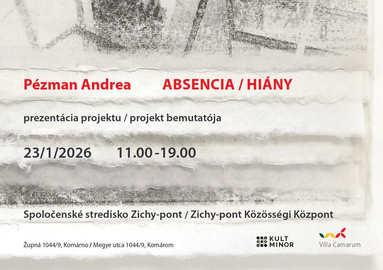 ABSENCIA. Prezentácia projektu výtvarníčky Andrey Pézman v Komárne. Miesto: Spoločenské stredisko Zichy-pont, Župná 1044/9, Komárno, 94501 Komárno. Čas: 23. január 2026 (piatok), 11:00-19:00. Viac informácií na Facebooku: