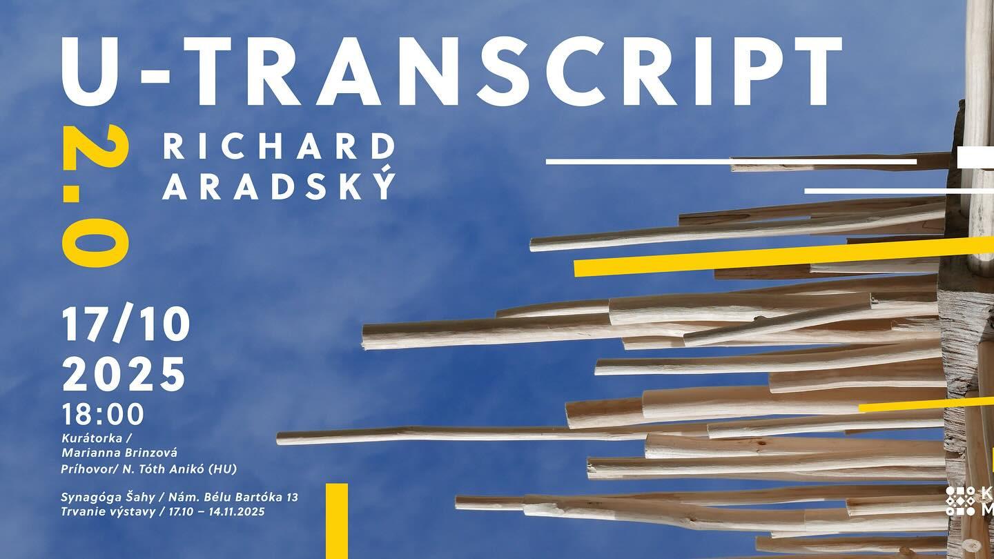Výstavu Richarda Aradského U-Transcript si môžete pozrieť v Šahách v budove Menora Saag Centrum Artis (bývalá synagóga). Kurátorka: Marianna Brinzová. Vernisáž: 17. októbra 2025, 18:00. Príhovor: Anikó N. Tóth. Trvanie výstavy: 17. októbra - 14. novembra 2025.