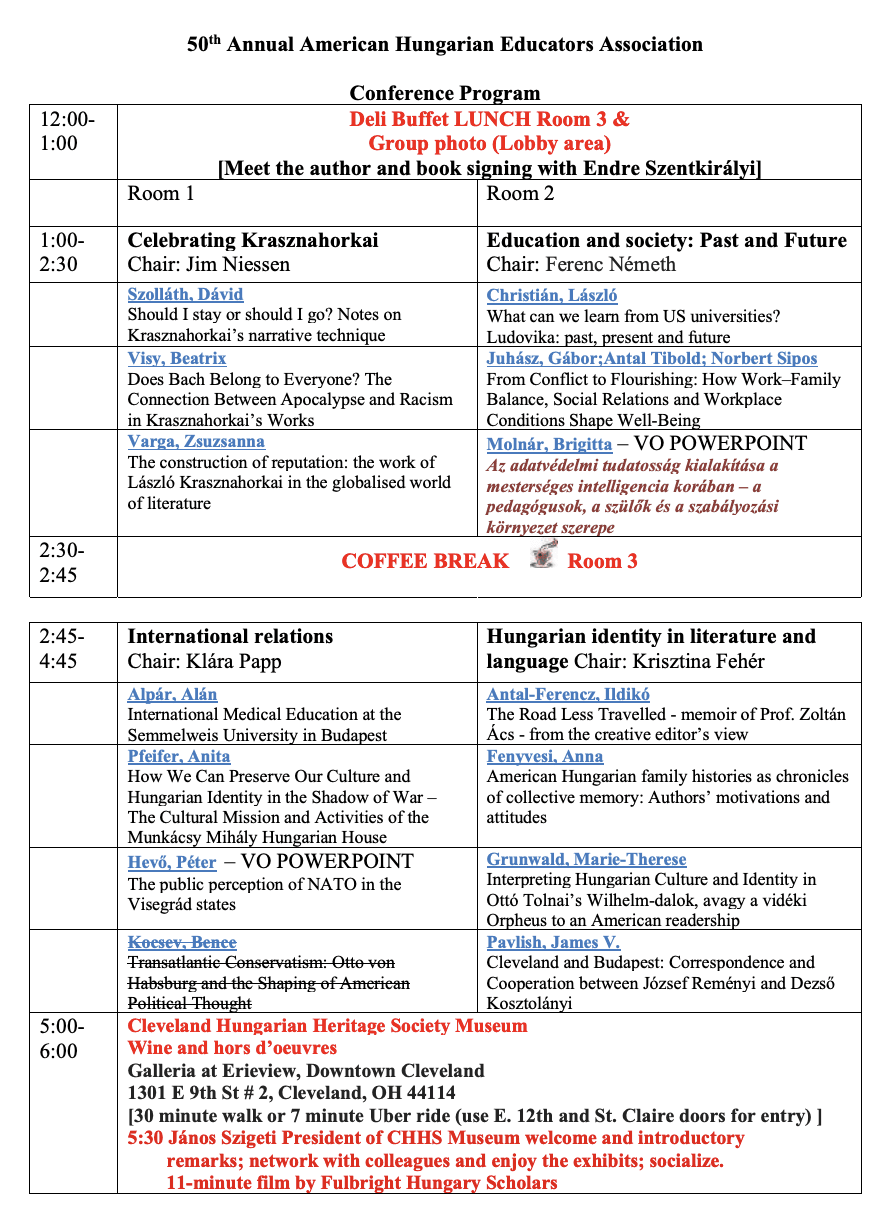 250 év – Magyar történetek és értékek az Amerikai Egyesült Államokban. Visy Beatrix és Szolláth Dávid is előadást tartott a Clevelandi Állami Egyetemen az AHEA — Amerikai Magyar Pedagógusok Szövetsége jubileumi, 50. konferenciáján. Bővebb információk és teljes program az AHEA honlapján: https://ahea.net/conferences/2026-cleveland-state-university/conference-theme-and-sponsors.
