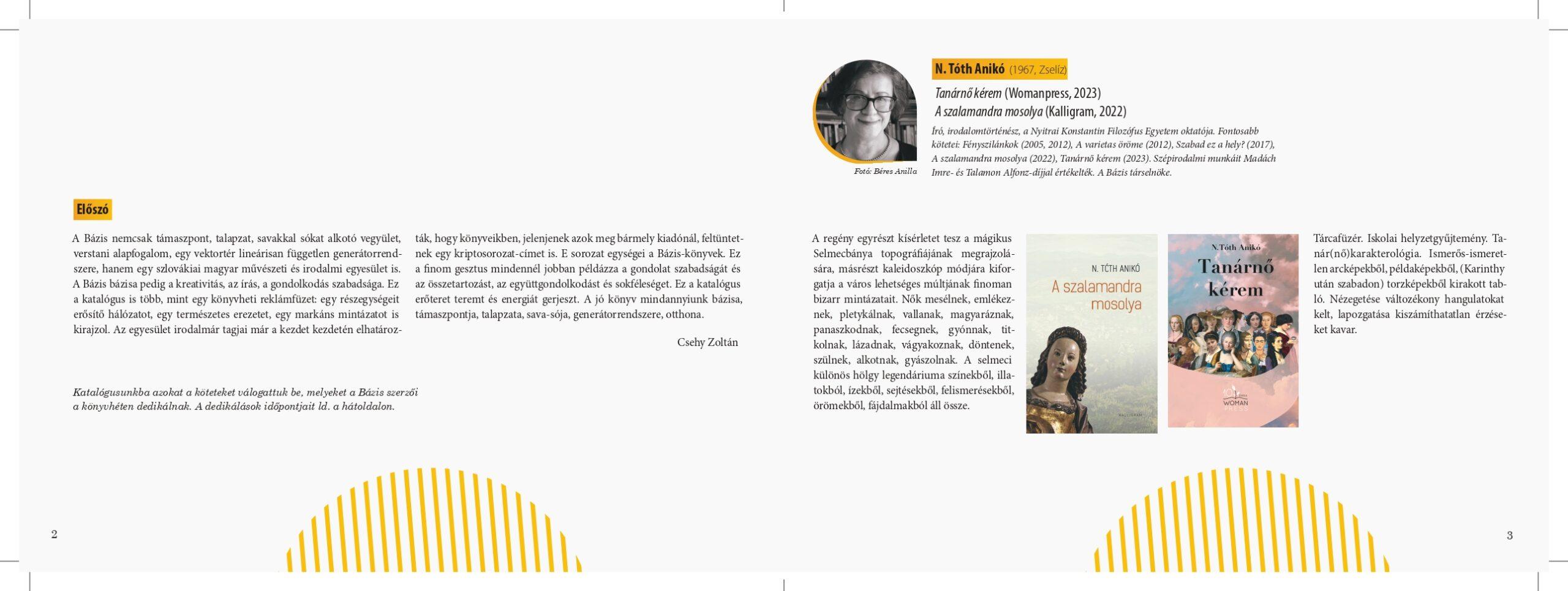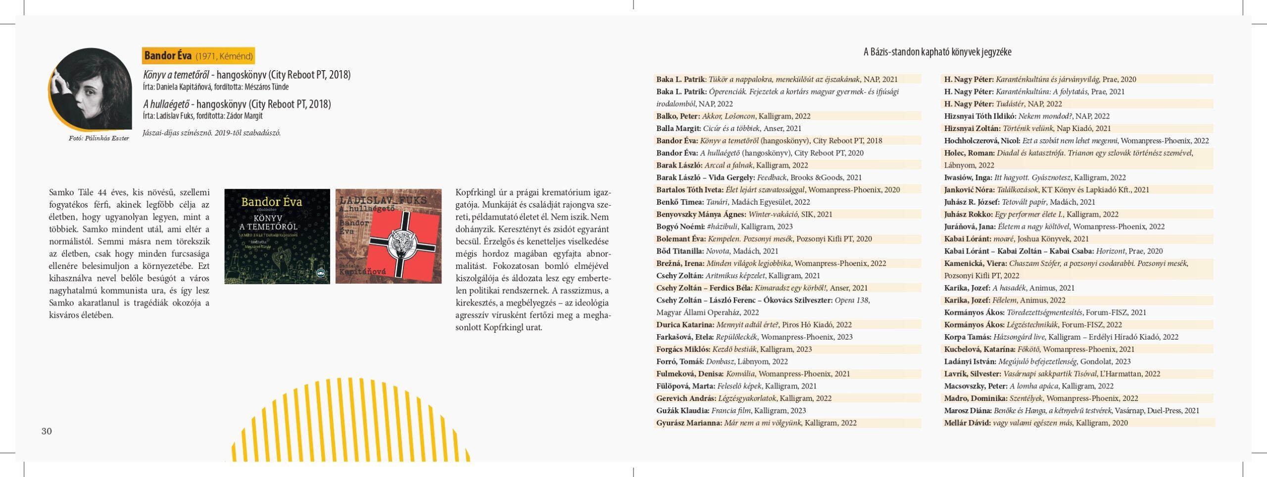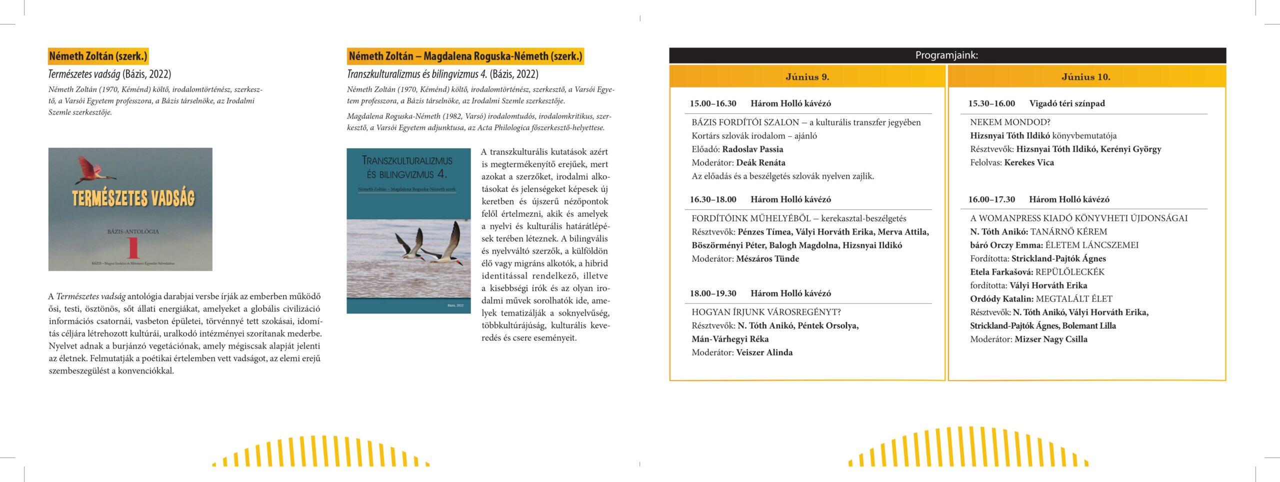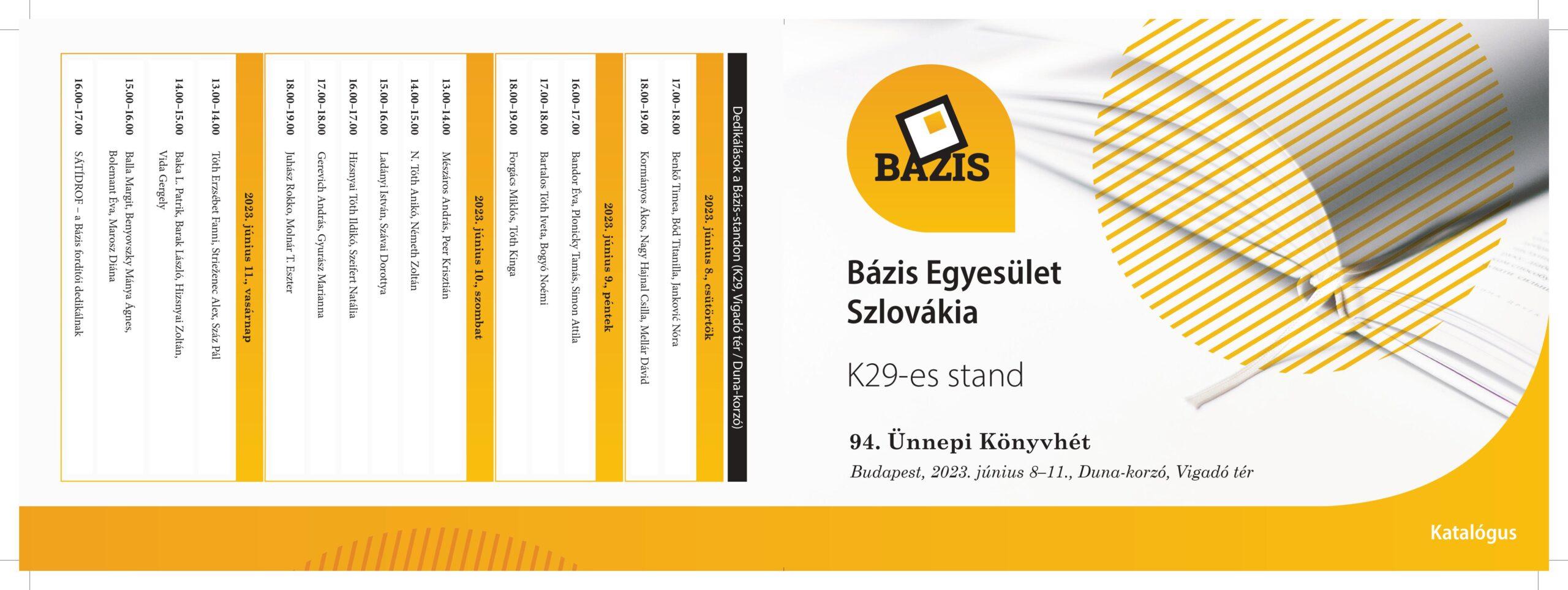A Bázis önálló standdal és több programmal vesz részt a 94. Budapesti Könyvhéten 2023. június 8-11. között. A katalógus borítójából a dedikálások és a programok pontos időpontjai, a katalógusból pedig a dedikáló szerzők és köteteik adatai tölthetők le. Az eseményt a Kisebbségi Kulturális Alap támogatja.