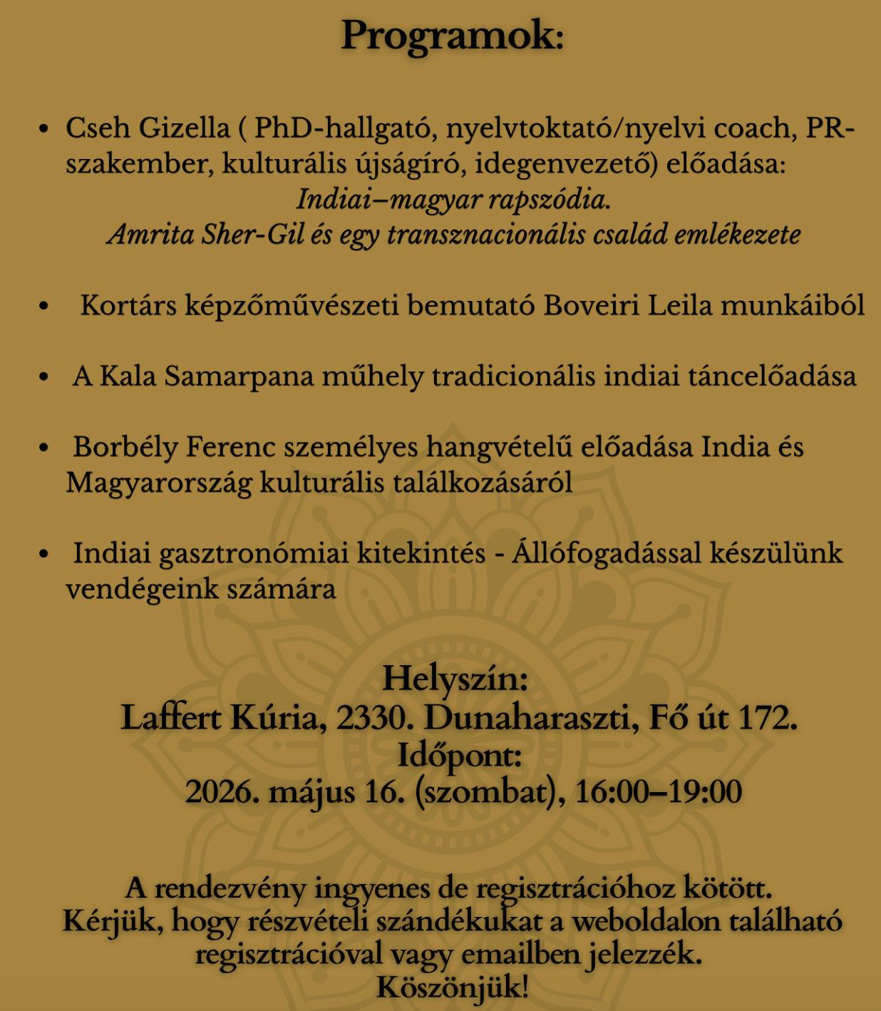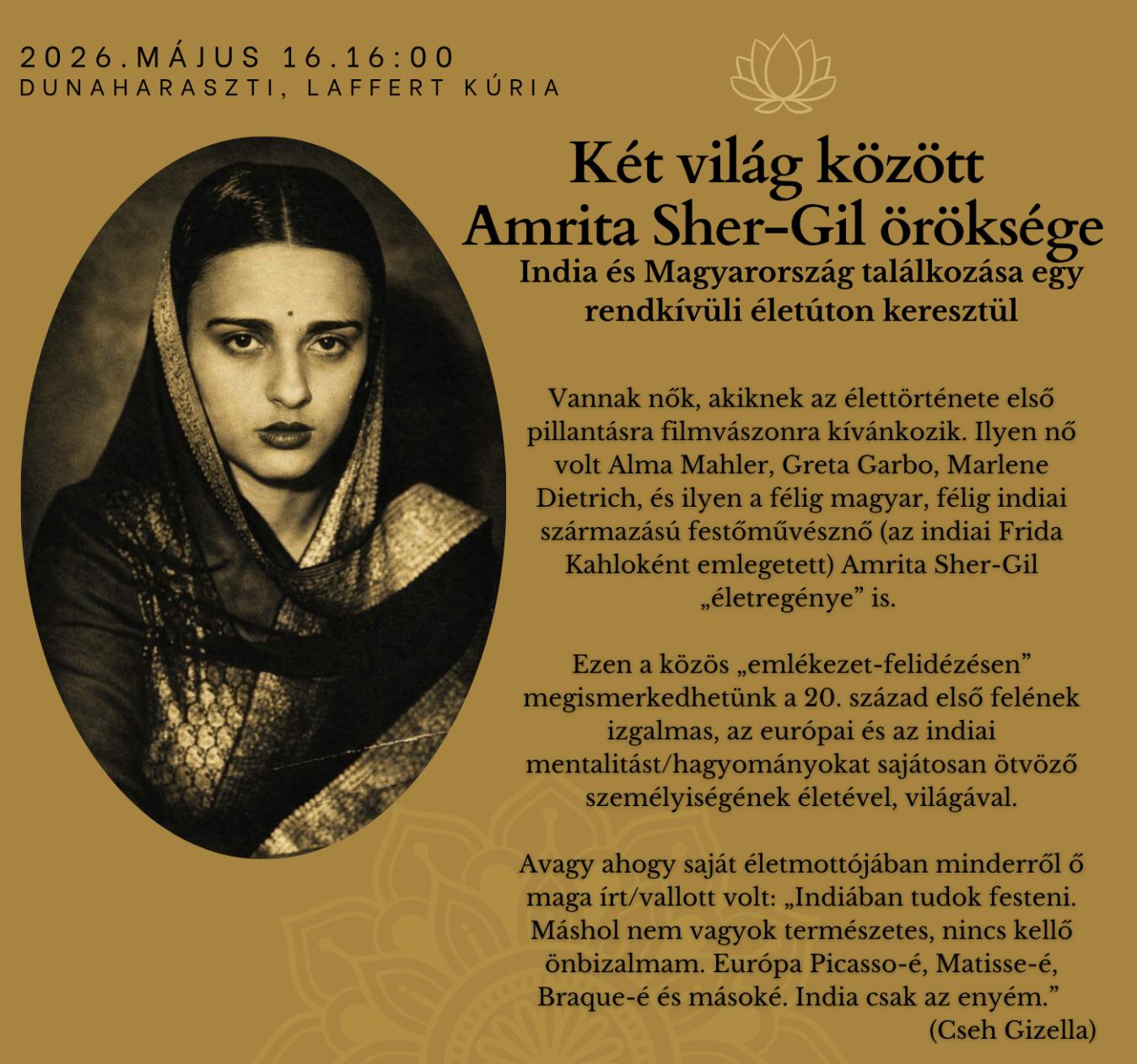 Cseh Gizella tart előadást Amrita Sher-Gil örökségéről Dunaharasztiban, a Laffert Kúriában 2026. május 16-án. Bővebb információk: https://dunaharasztikultura.hu/2026-majus-16-ket-vilag-kozott-amrita-sher-gil-oroksege/.