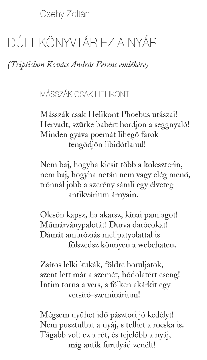 Csehy Zoltán Kovács András Ferenc emlékére írt, Dúlt könyvtár ez a nyár című verse a Látó 2024/7. számában jelent meg. Teljes terjedelemben a nyomtatott Látóban vagy a Szófán olvasható.