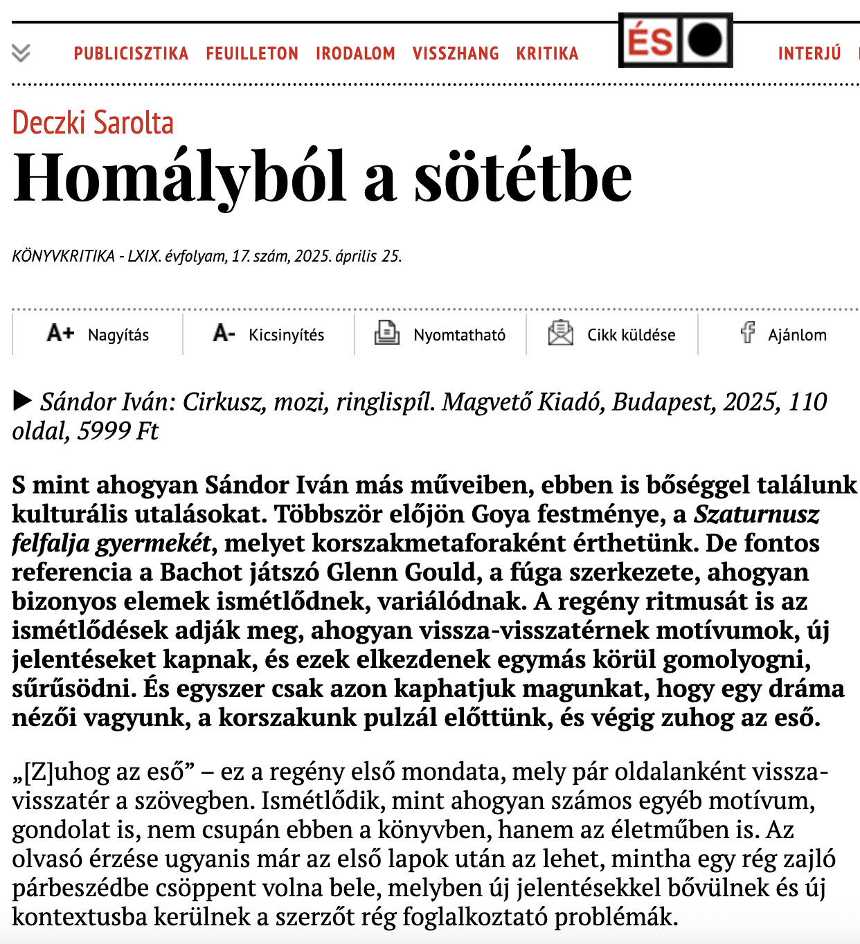 Deczki Sarolta kritikája Sándor Iván Cirkusz, mozi, ringlispíl című regényéről az Élet és Irodalomban jelent meg. Teljes terjedelemben az ÉS online felületén olvasható.