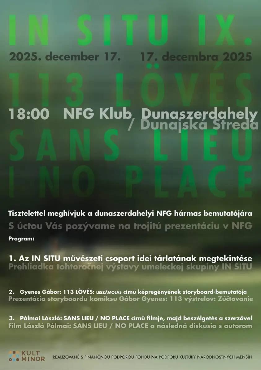 Hármas bemutatóra kerül sor a dunaszerdahelyi NFG klubban 2025. december 17-én. Várható program: 18.00 - 18:30 IN SITU-megnyitó, 18:30 - 19.00 a 113 lövés storyboardjának bemutatója, 19.00 - 19:30 Pálmai László filmjének levetítése, 19:30-20.00 online beszélgetés Pálmai Lászlóval.