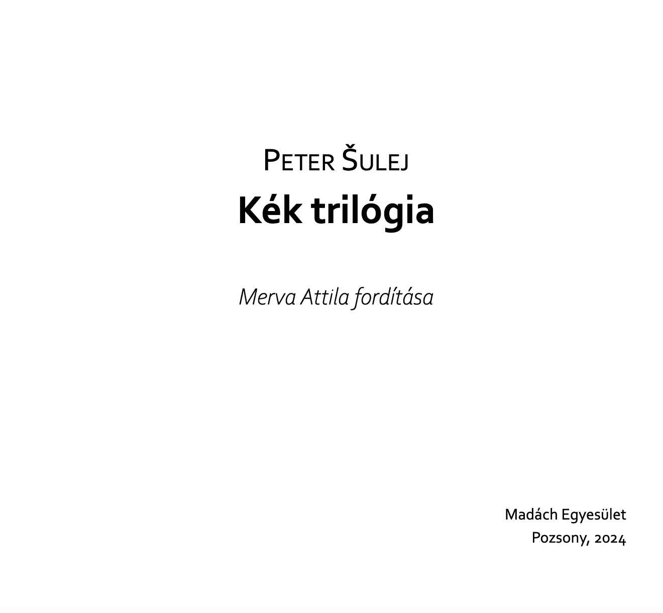 Merva Attila fordításában jelent meg Peter Šulej Kék trilógia című kötete a Madách Egyesület gondozásában, a Bázis-könyvek sorozat 54. darabjaként. Kiadó és szerkesztő: Csanda Gábor. Borító, tördelés: Juhász Rokko.