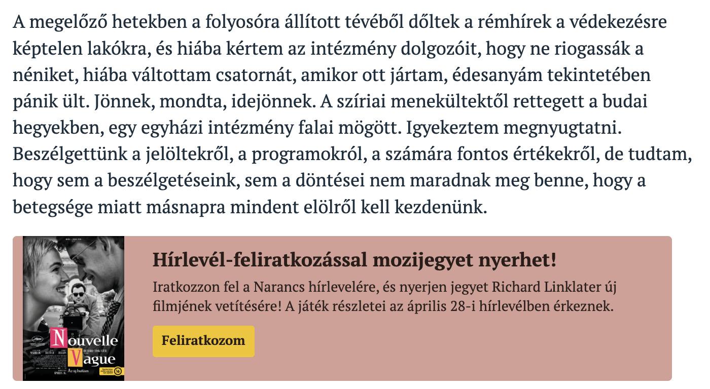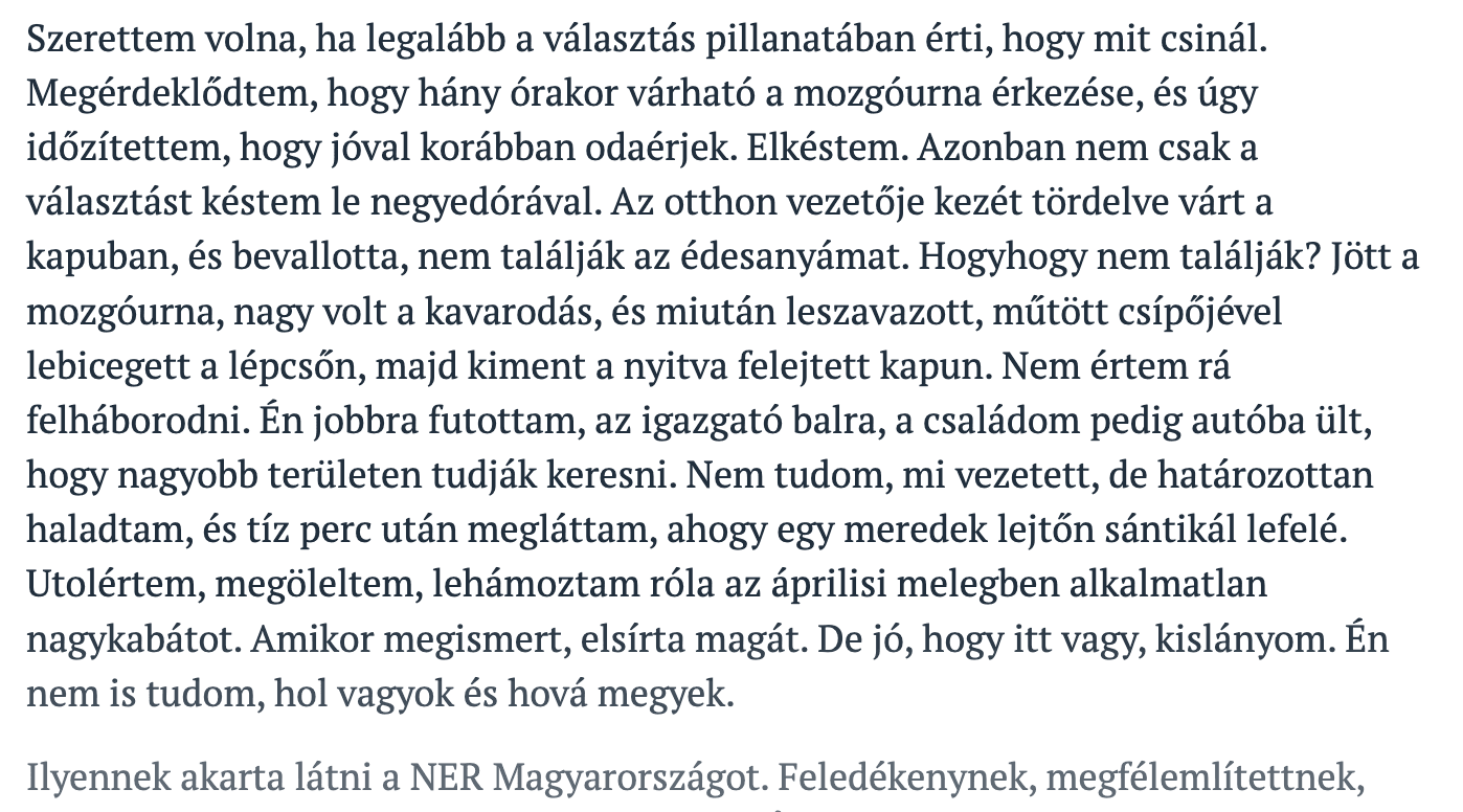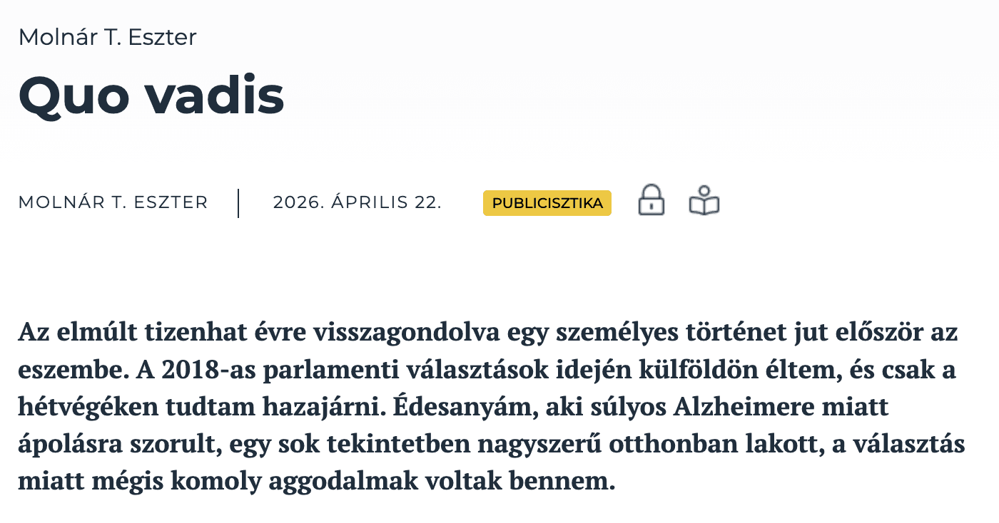 Molnár T. Eszter Quo vadis című írása a Magyar Narancsban jelent meg. Teljes terjedelemben a nyomtatott Magyar Narancsban, illetve a lap online felületén olvasható.