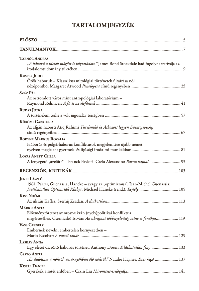 Száz Pál tanulmánya is olvasható a Háború és béke a kortárs világirodalomban című tanulmánykötetben, amely Kiss Noémi és Körömi Gabriella szerkesztésében jelent meg az Eszterházy Károly Katolikus Egyetem Líceum Kiadójának gondozásában.