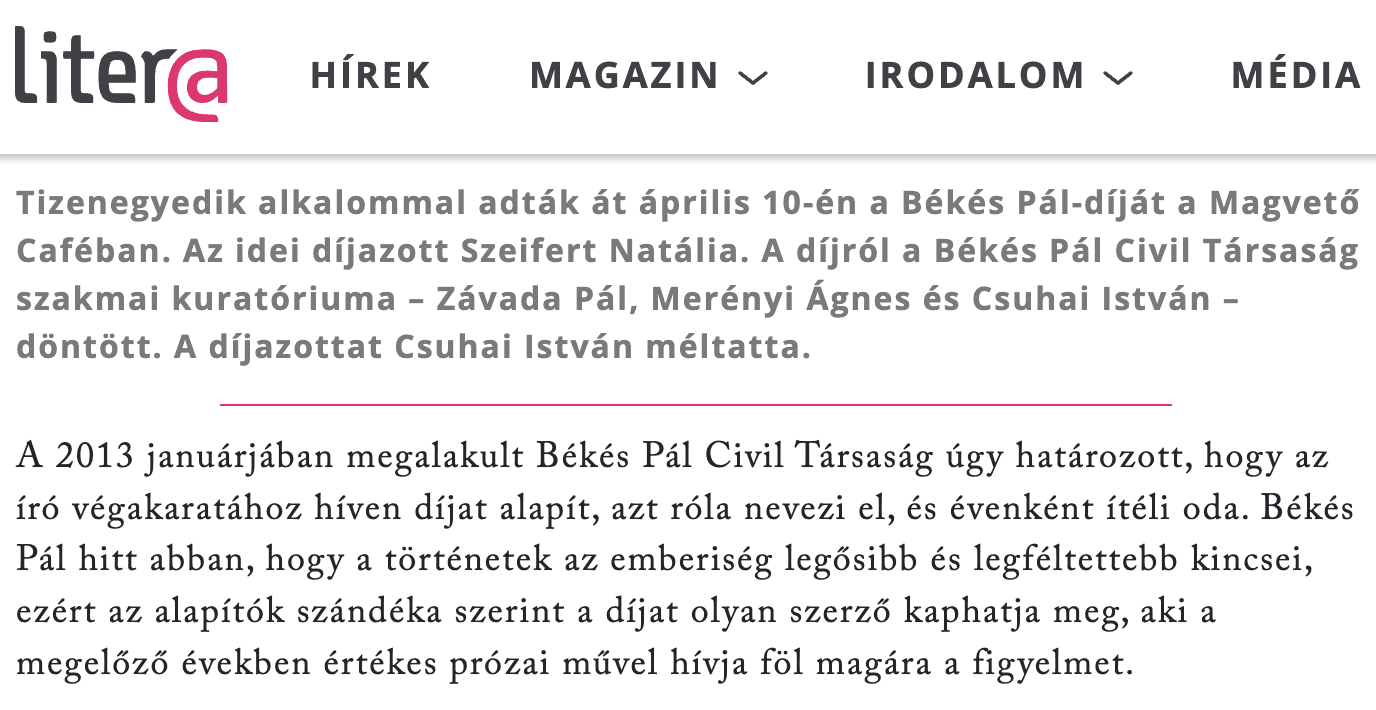 Szeifert Natália kapta a 2026. évi Békés Pál-díjat! A díjról a Békés Pál Civil Társaság szakmai kuratóriuma – Závada Pál, Merényi Ágnes és Csuhai István – döntött. A díjazottat Csuhai István méltatta. Gratulálunk Szeifert Natáliának, a Bázis tagjának! További részletek a Literán olvashatók.