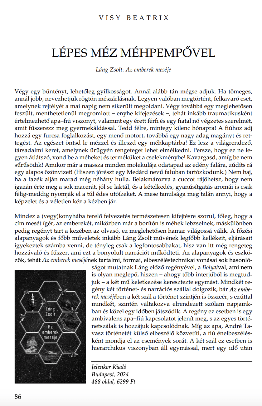 Visy Beatrix kritikája Láng Zsolt Az emberek meséje című regényéről a Jelenkor 2025/1. számában jelent meg. Teljes terjedelemben a nyomtatott Jelenkorban olvasható.