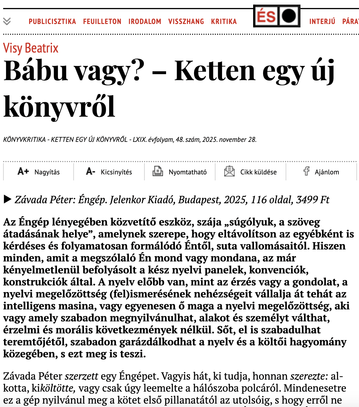 Visy Beatrix kritikája Závada Péter Éngép című verseskötetéről az Élet és Irodalomban jelent meg. Teljes terjedelemben az ÉS online felületén olvasható.